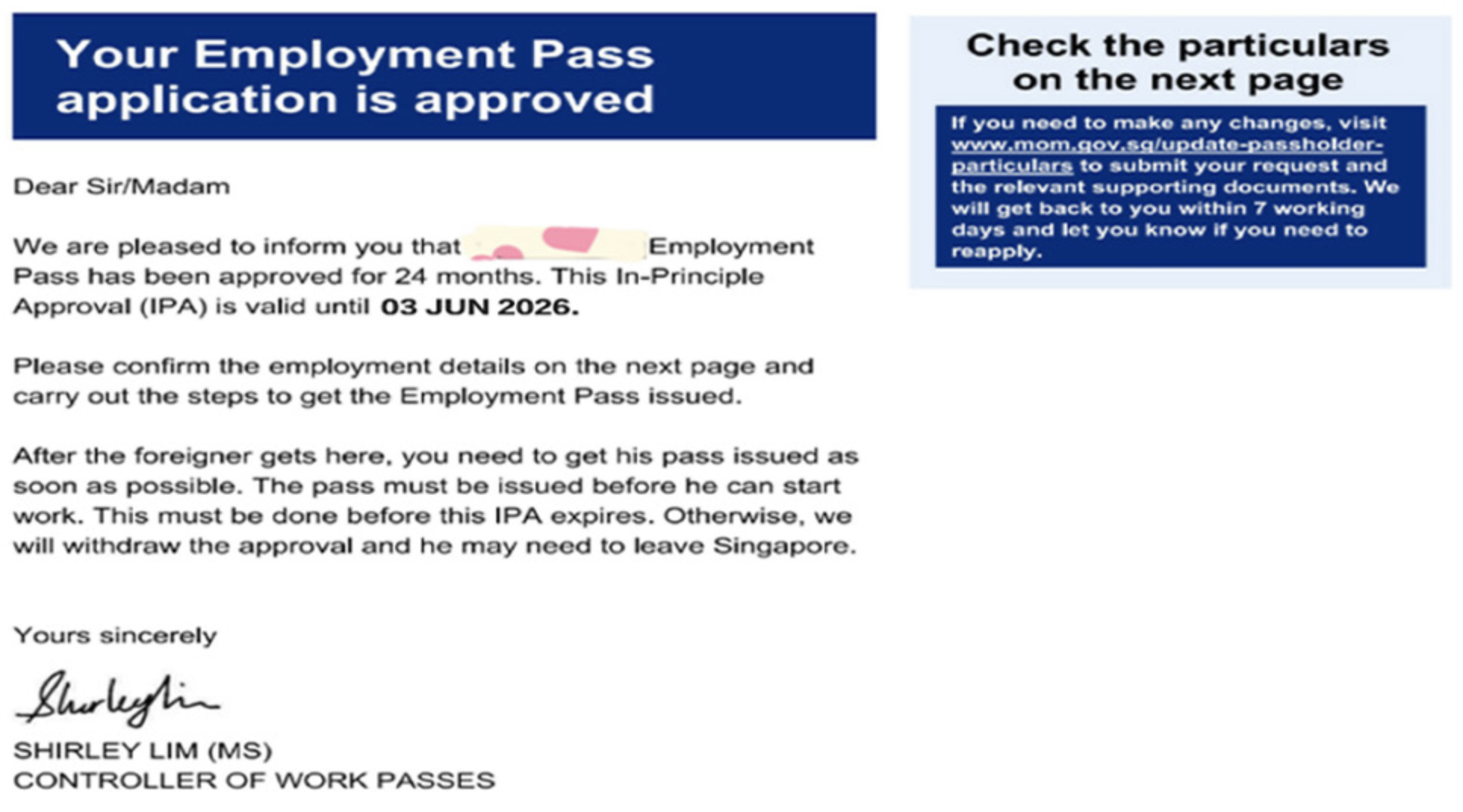 从注册公司到申请EP和家属准证共用时1个半月,顺利获批,客户同时委托帮助为孩子申请院校,预计下月登陆新加坡。